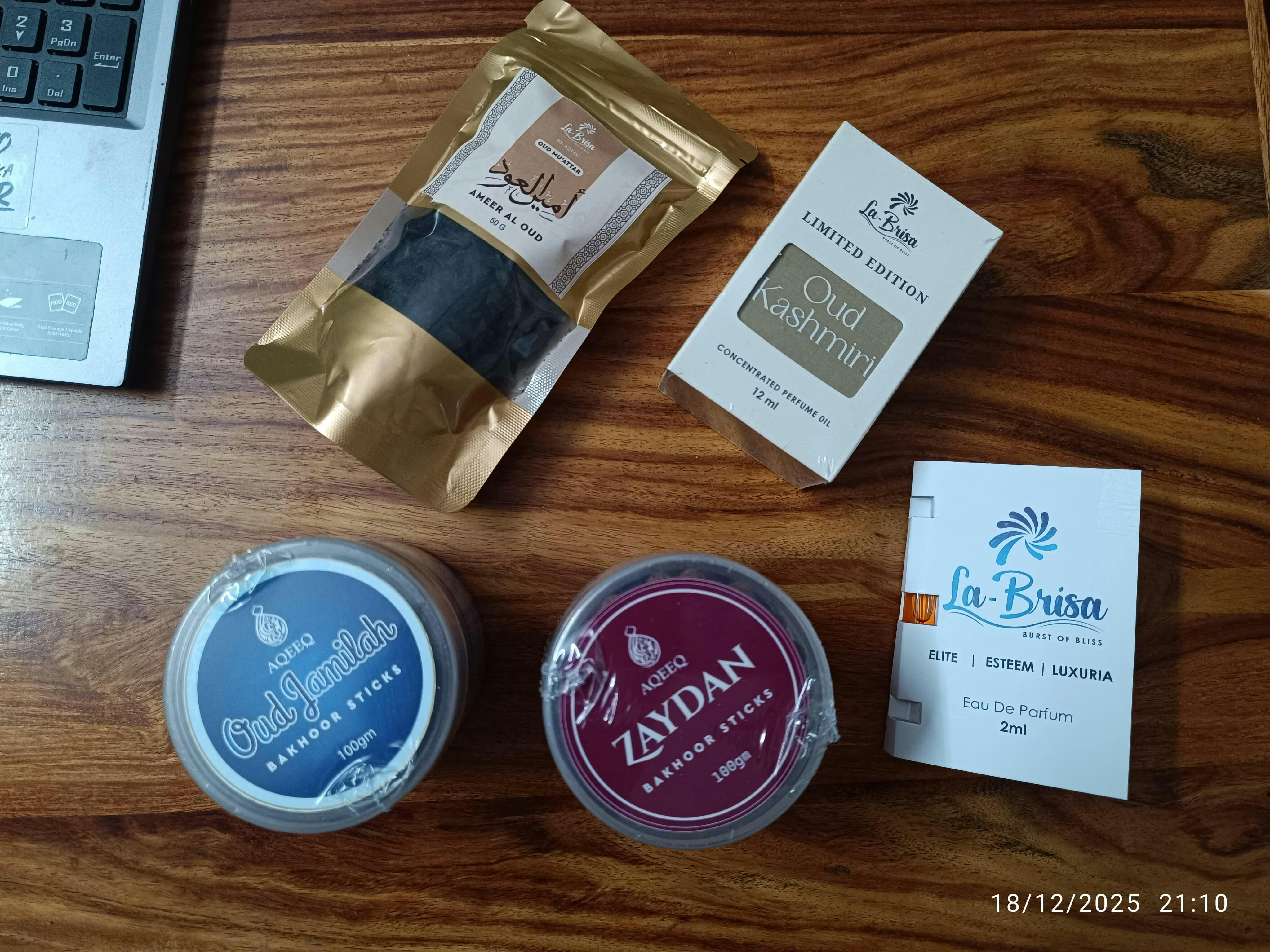The fragrance opens with a graceful blend of rose, cedar, sandalwood, and clove, gently unfolding into a warm heart of patchouli, amber, and authentic oud. It settles into a deep, comforting base of musk, amber, and agarwood, creating a soulful aroma that feels both luxurious and spiritual.