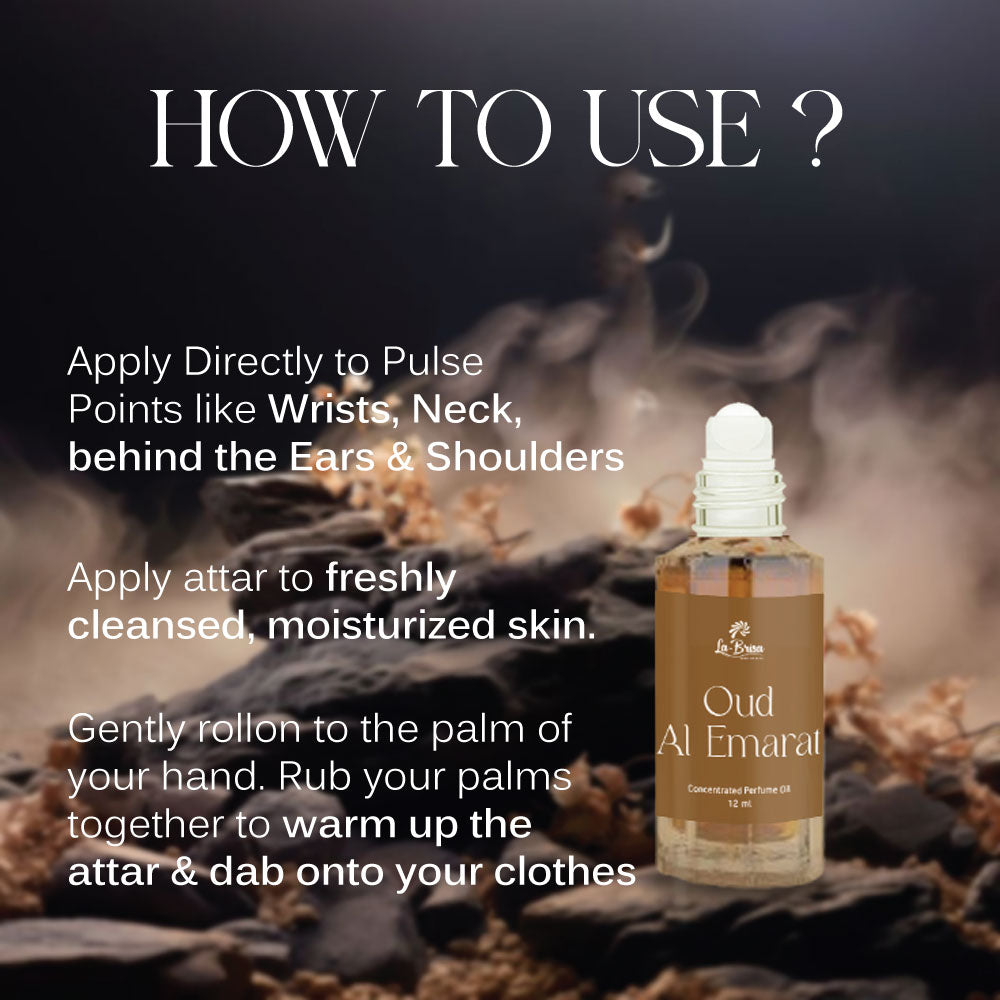 Experience the timeless luxury of La Brisa Oud Emarat Attar For Men 12ml, a limited edition premium oud attar crafted for men who desire elegance and strength in every drop. This long lasting oud attar opens with the richness of rose and saffron, blending into heart notes of musk and jasmine, and finally settling into a deep oriental base of patchouli, amber, and agarwood (oudh).