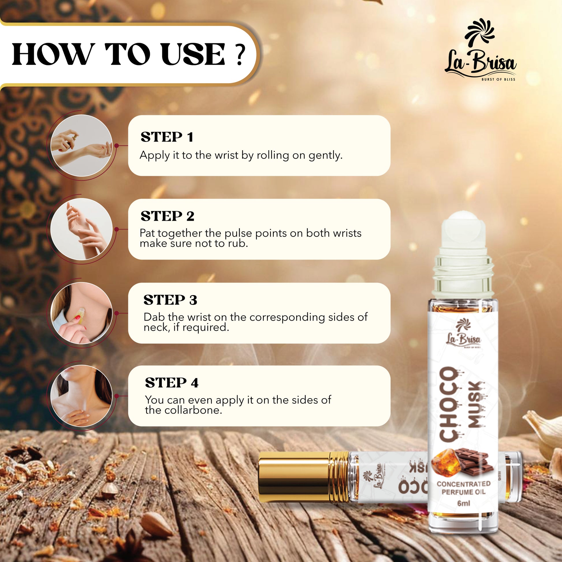 Description: La Brisa Choco Musk Attar is a premium unisex long lasting attar blending warm spice and amber with sweet powdery vanilla and a rich chocolate-musk base. This luxury alcohol-free fragrance oil offers a smooth, gourmand oriental scent ideal for daily wear or special occasions.